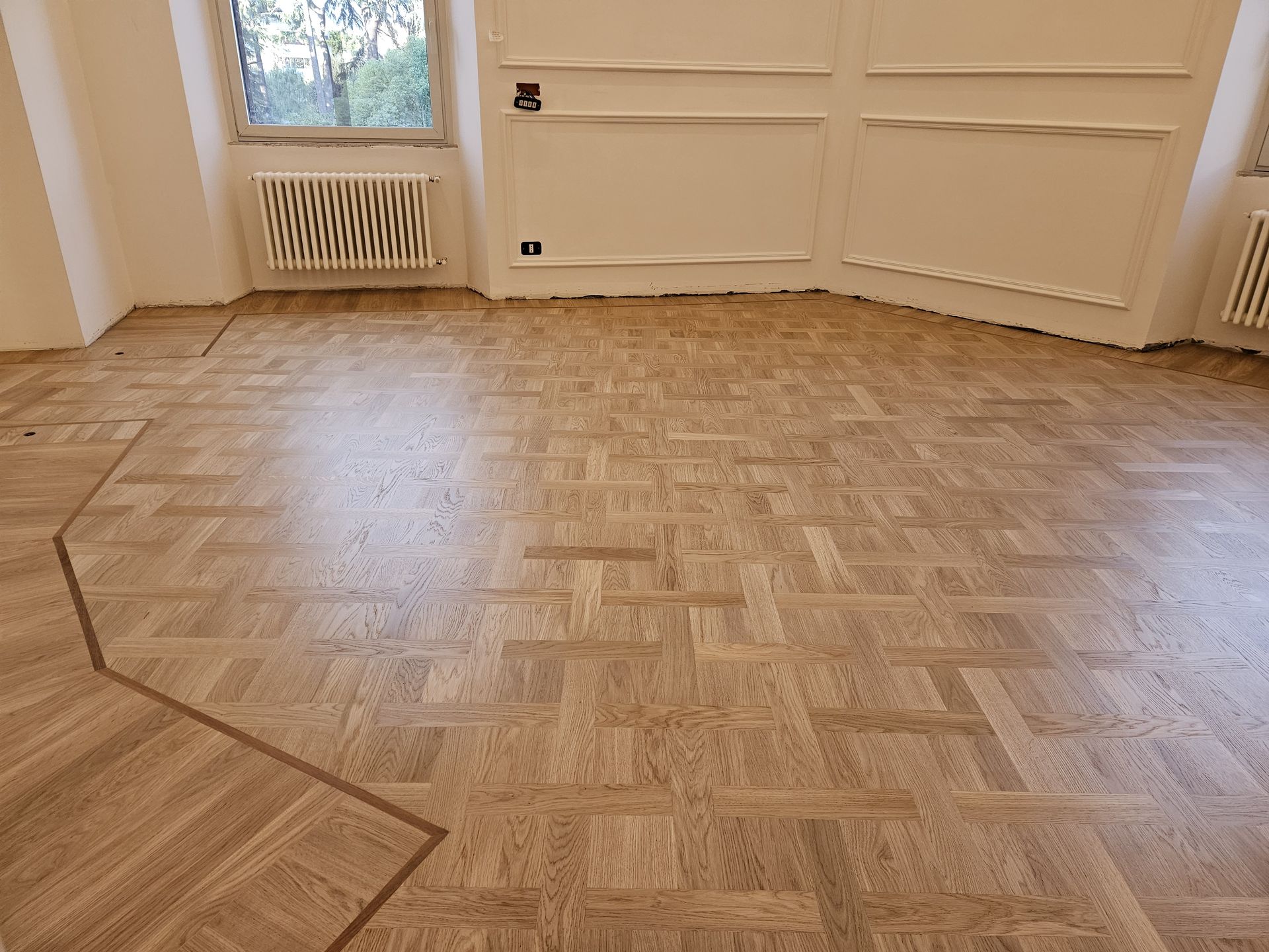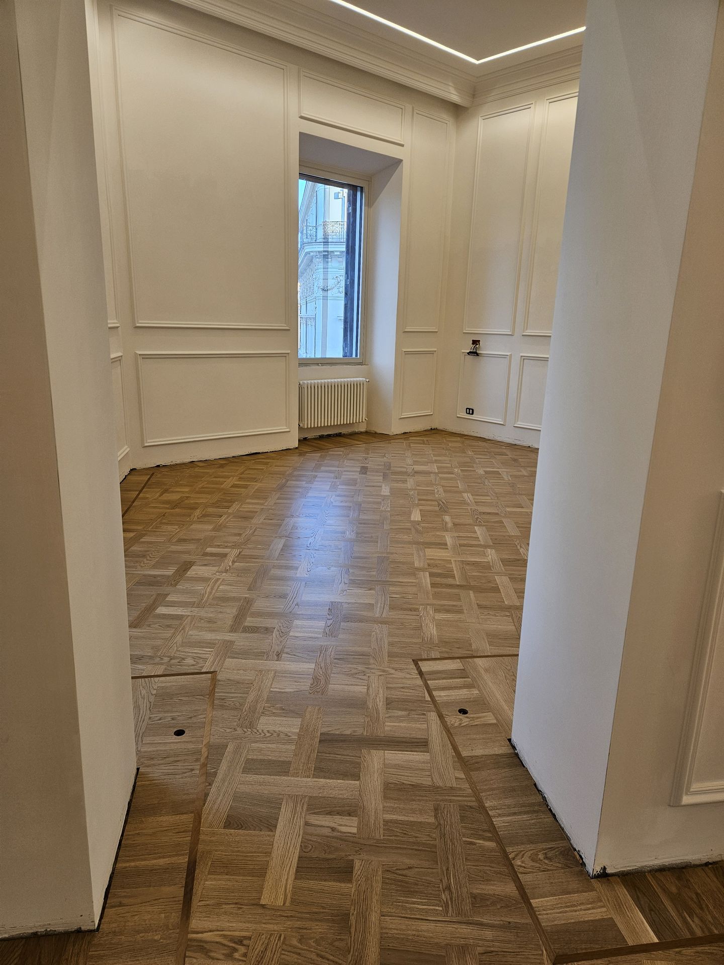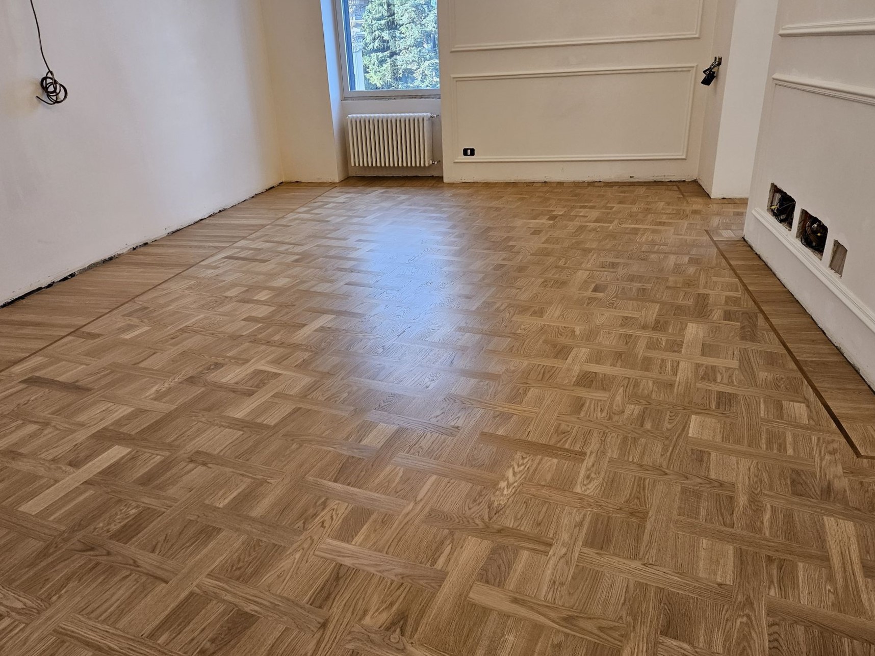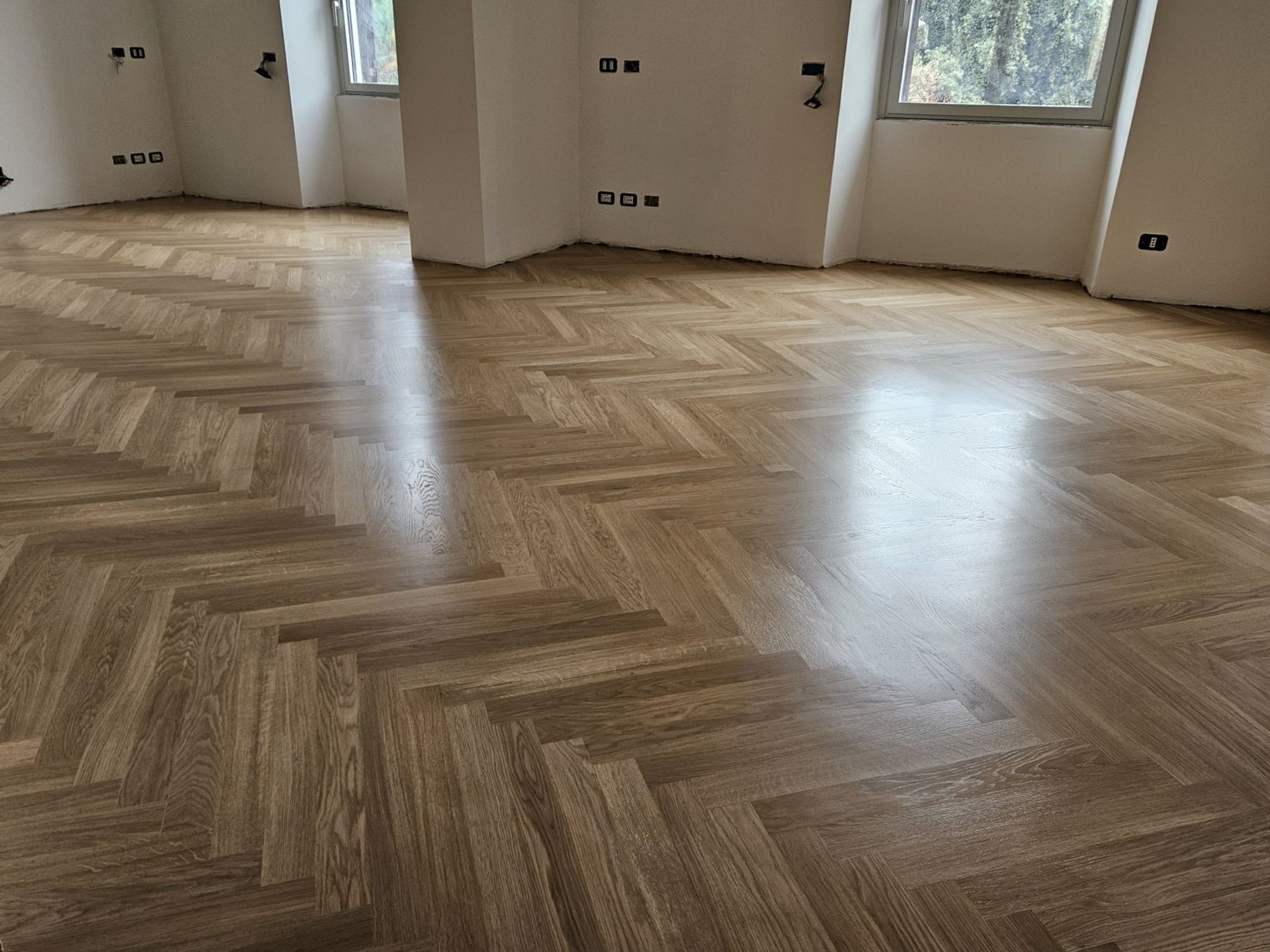 Per questo appartamento, situato in Centro Italia, ci siamo occupati della Fornitura e Posa in Opera, secondo le indicazioni della Committenza, di Rovere Massello con Geometria di Posa a Spina di Pesce con Fasce, e Bindello di Iroko.