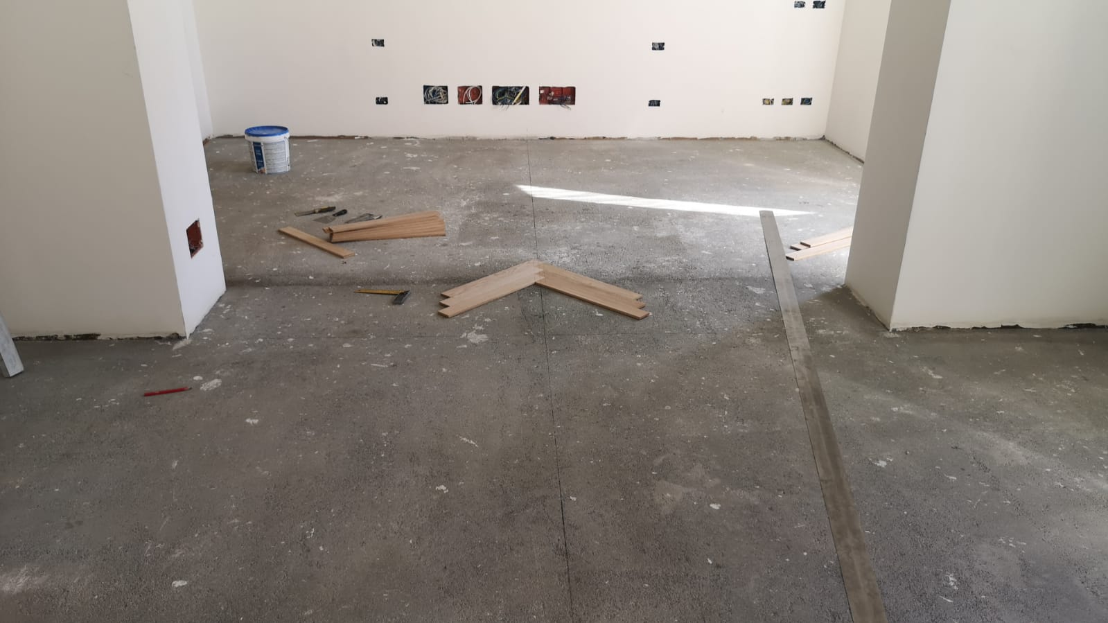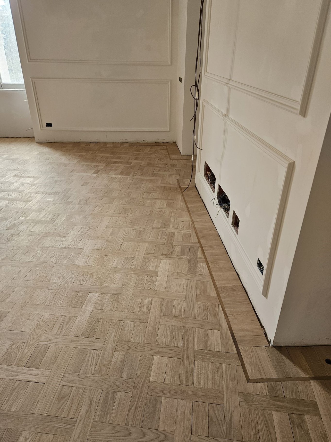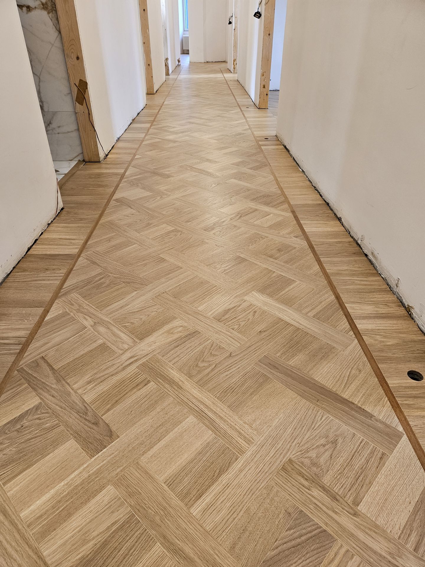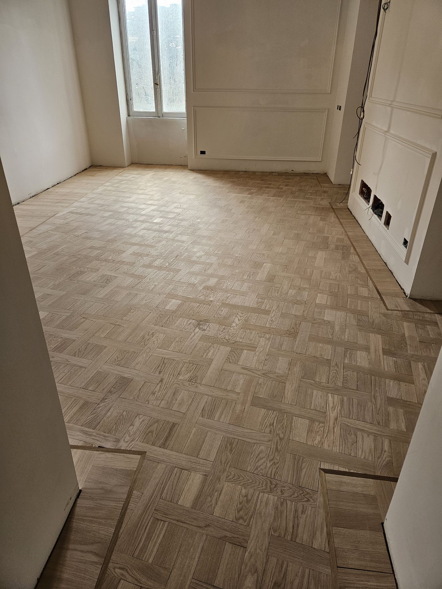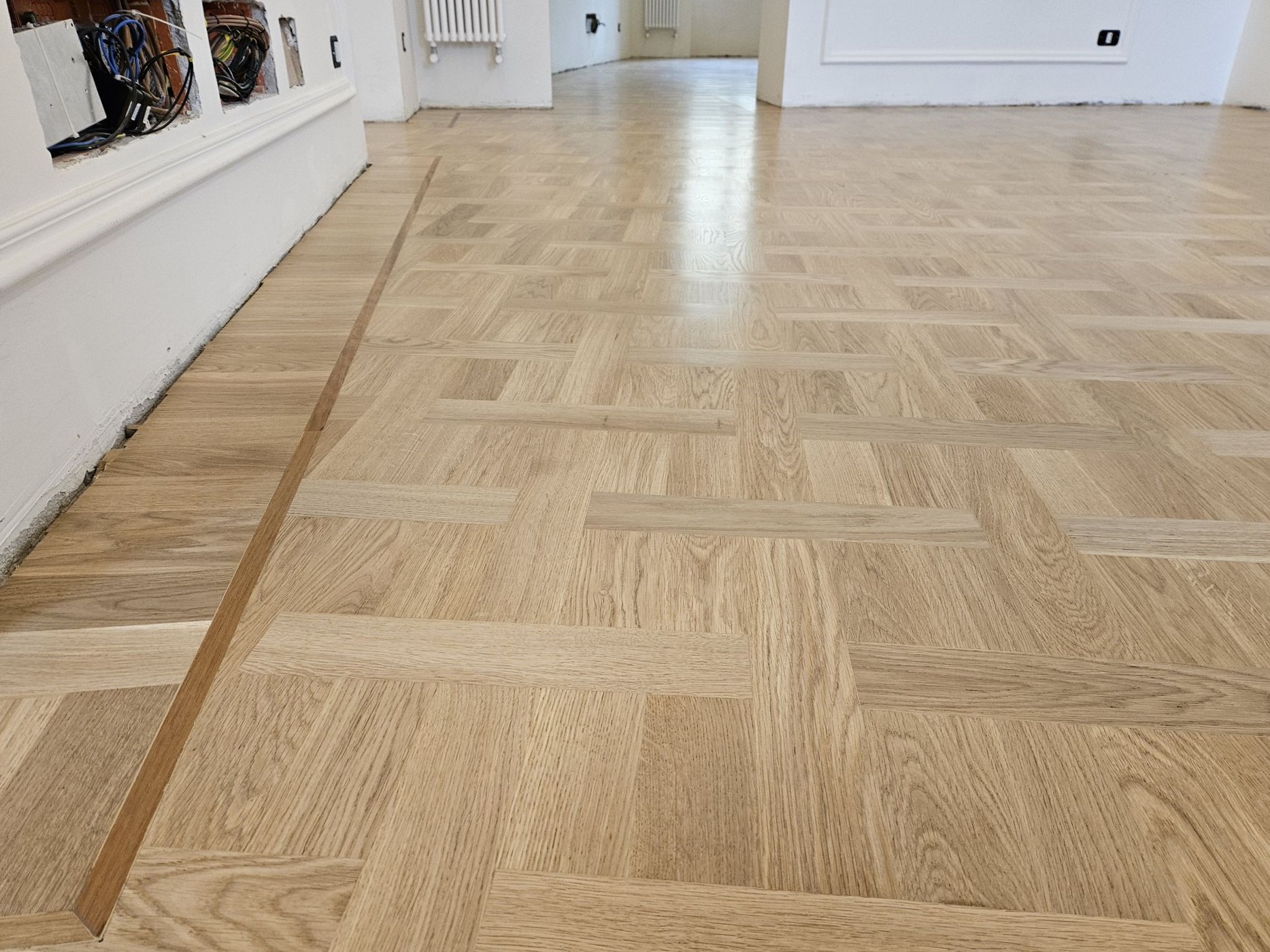 Per questo appartamento, situato in Centro Italia, ci siamo occupati della Fornitura e Posa in Opera, secondo le indicazioni della Committenza, di Rovere Massello con Geometria di Posa a Spina di Pesce con Fasce, e Bindello di Iroko.