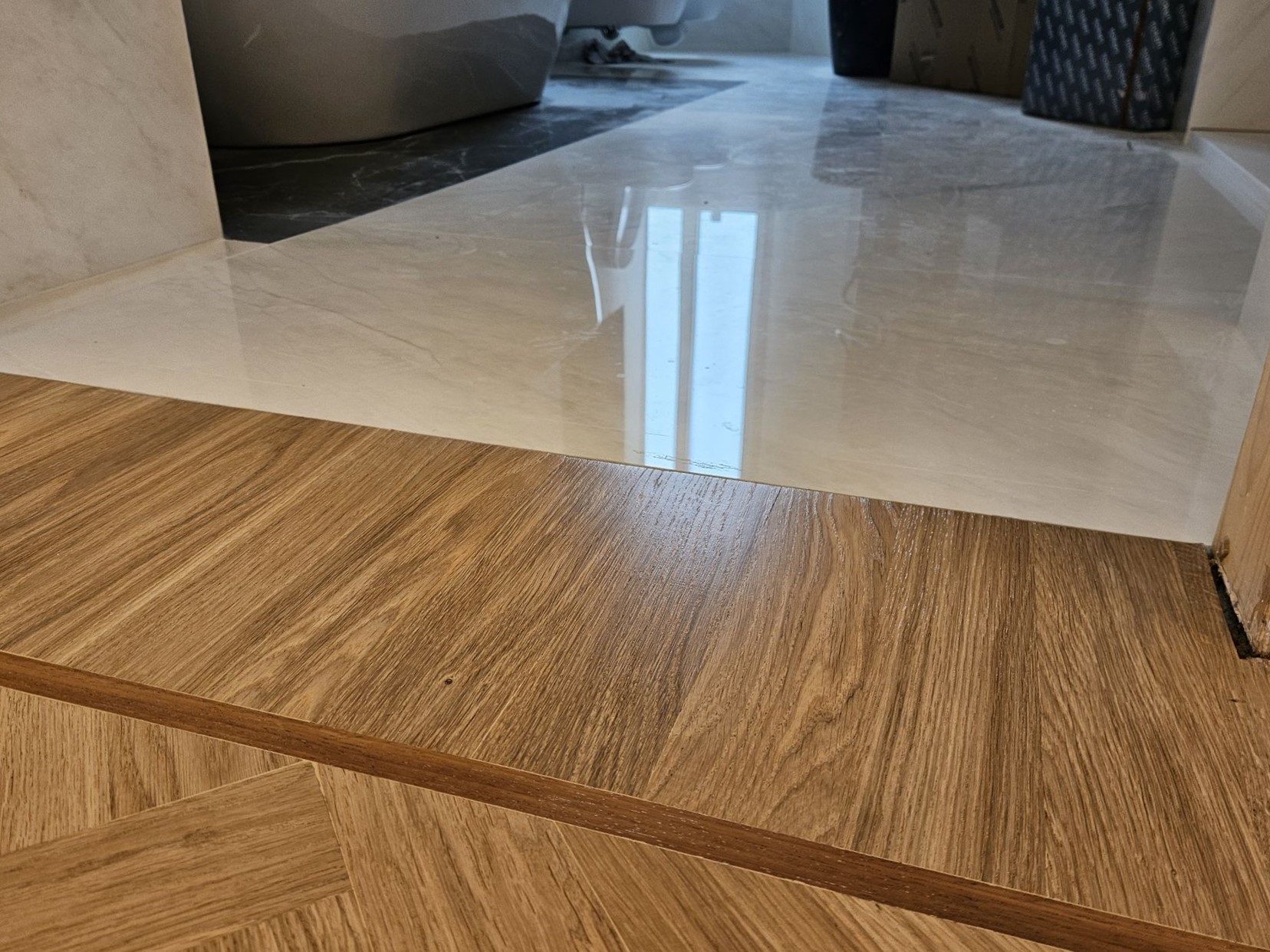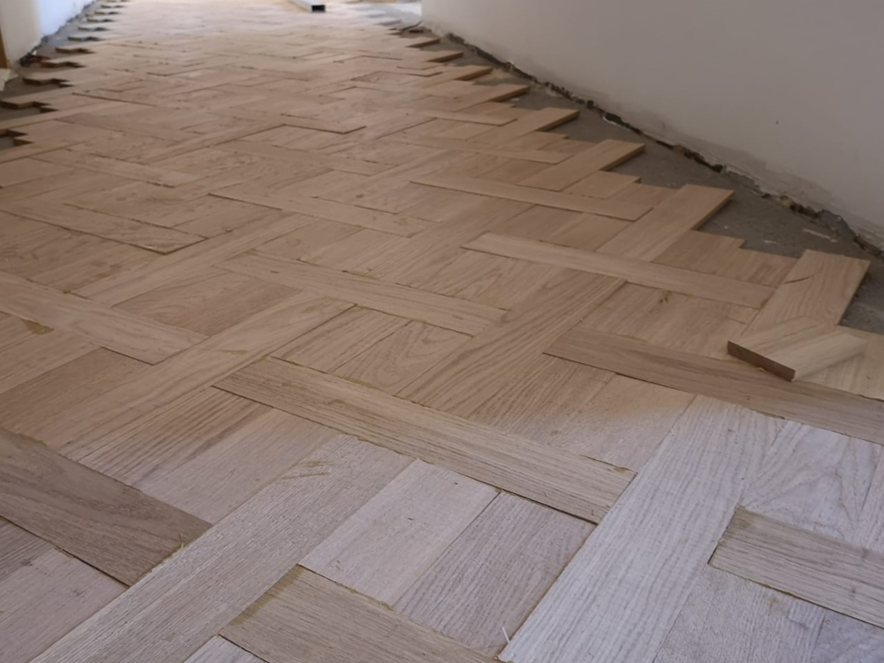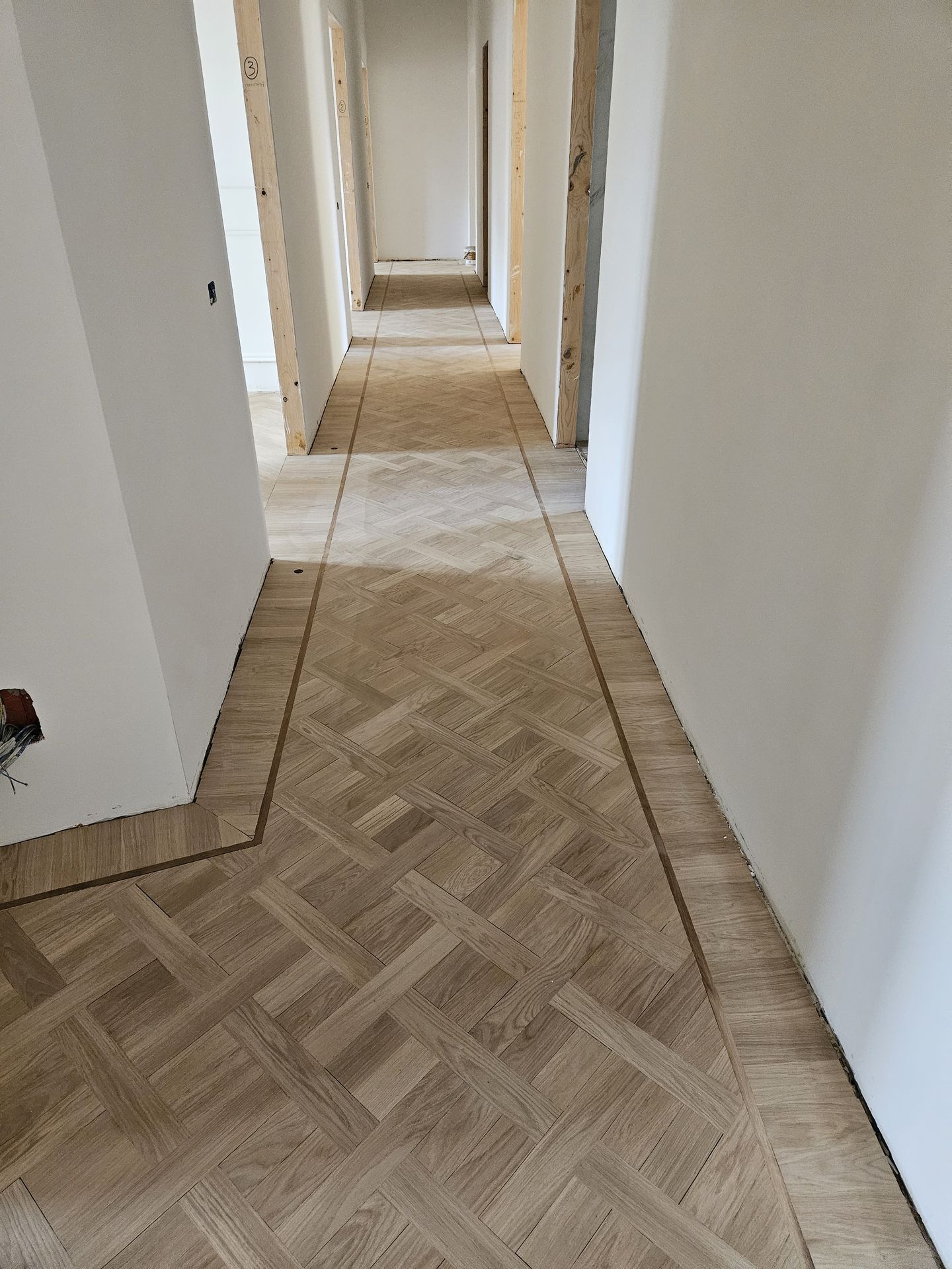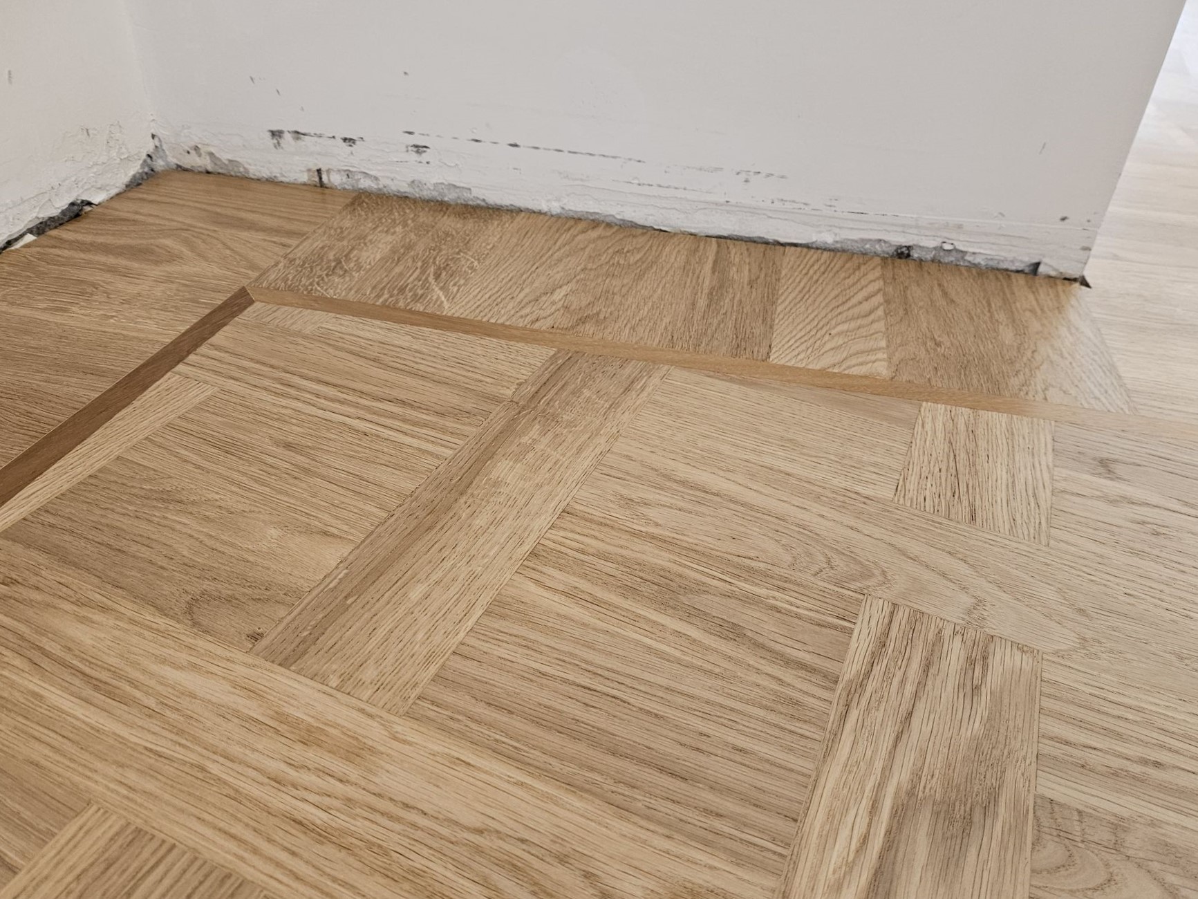 Per questo appartamento, situato in Centro Italia, ci siamo occupati della Fornitura e Posa in Opera, secondo le indicazioni della Committenza, di Rovere Massello con Geometria di Posa a Spina di Pesce con Fasce, e Bindello di Iroko.