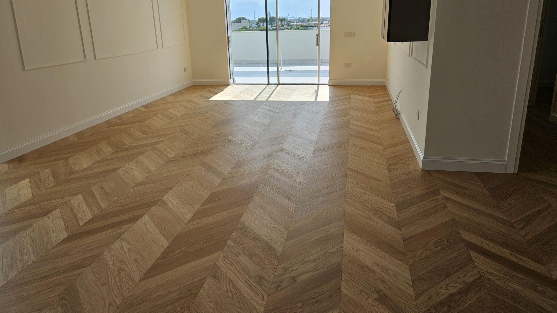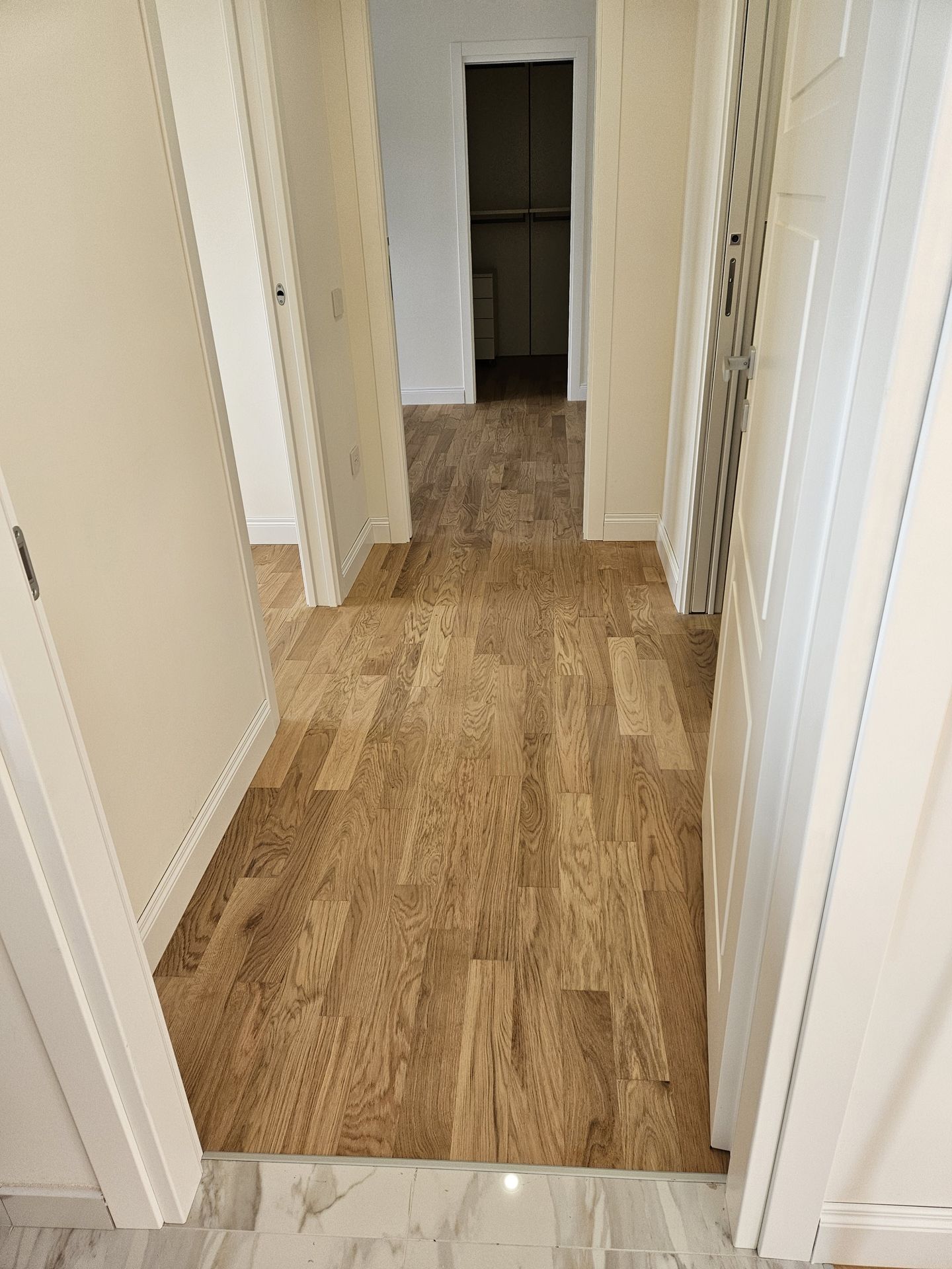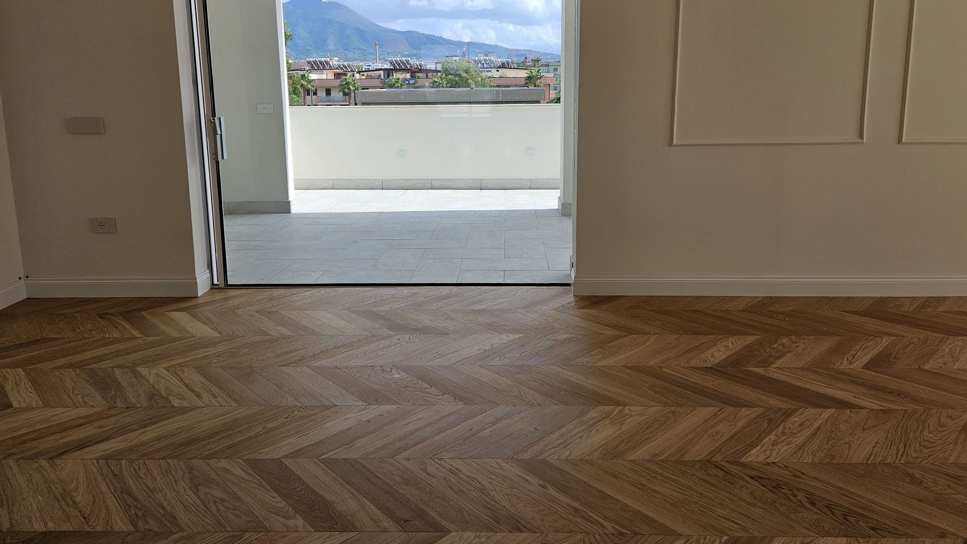 In questo Appartamento, abbiamo selezionato un Parquet Prefinito in Rovere, con taglio a 45° e con una finitura opaca. Questa combinazione porta all’ambiente uno stile Raffinato ma al tempo stesso Moderno. Incorniciato da un Battiscopa Ducale laccato 9010.