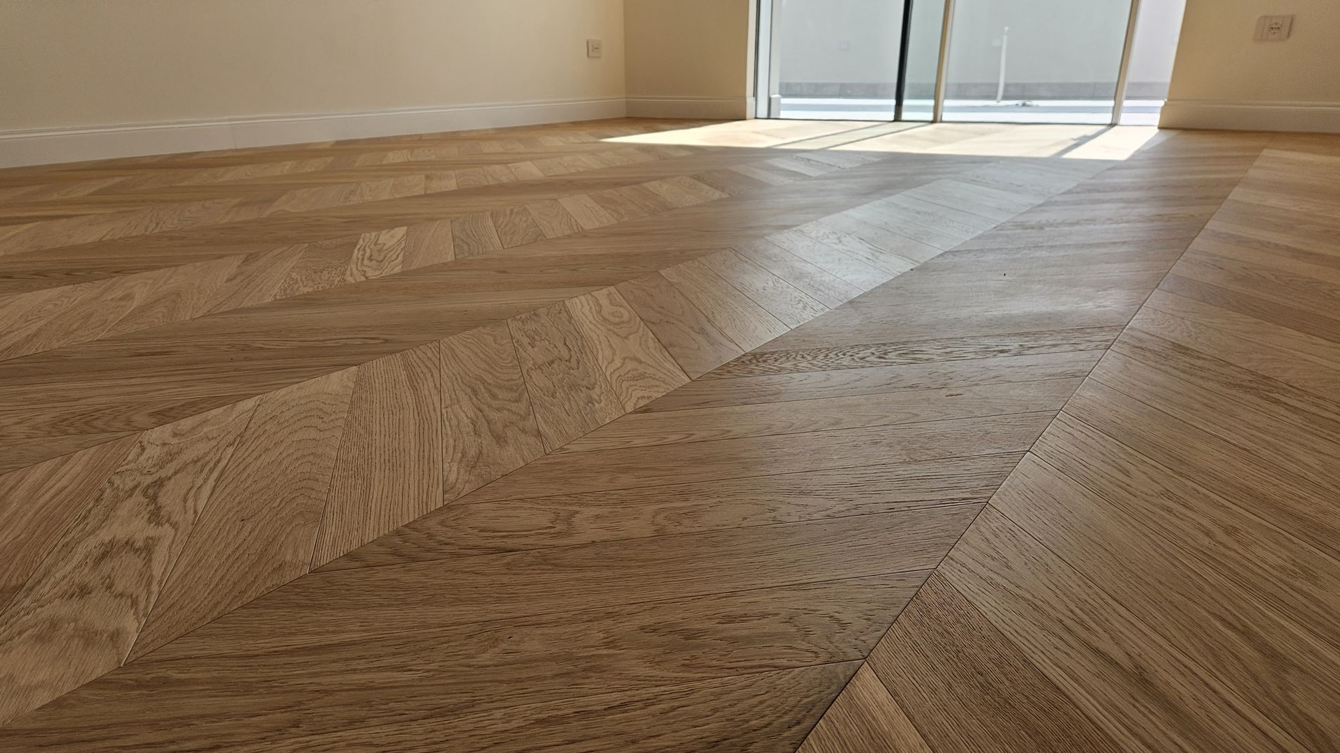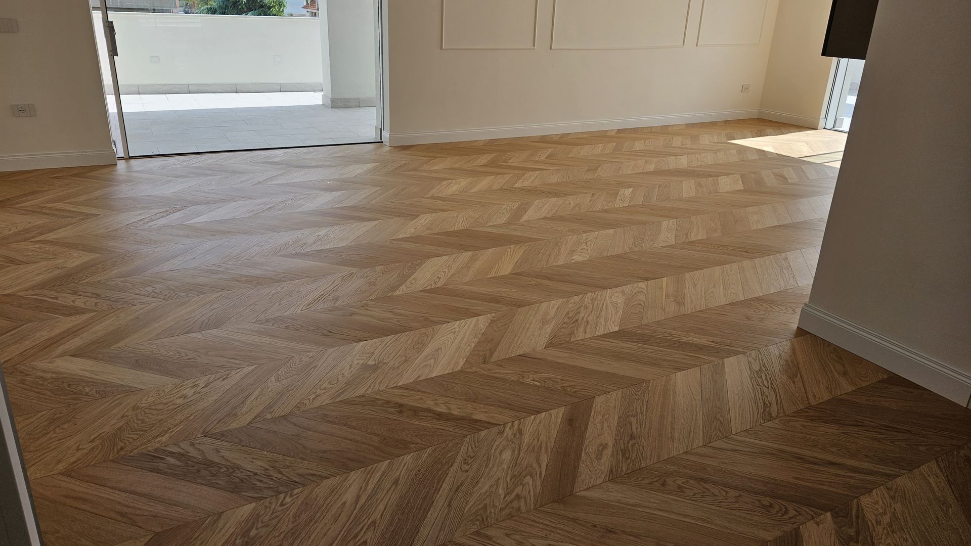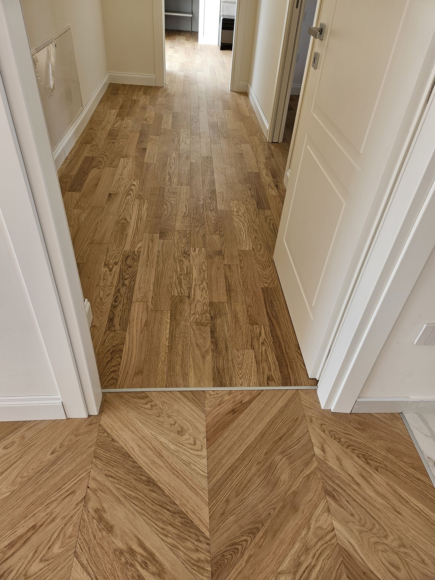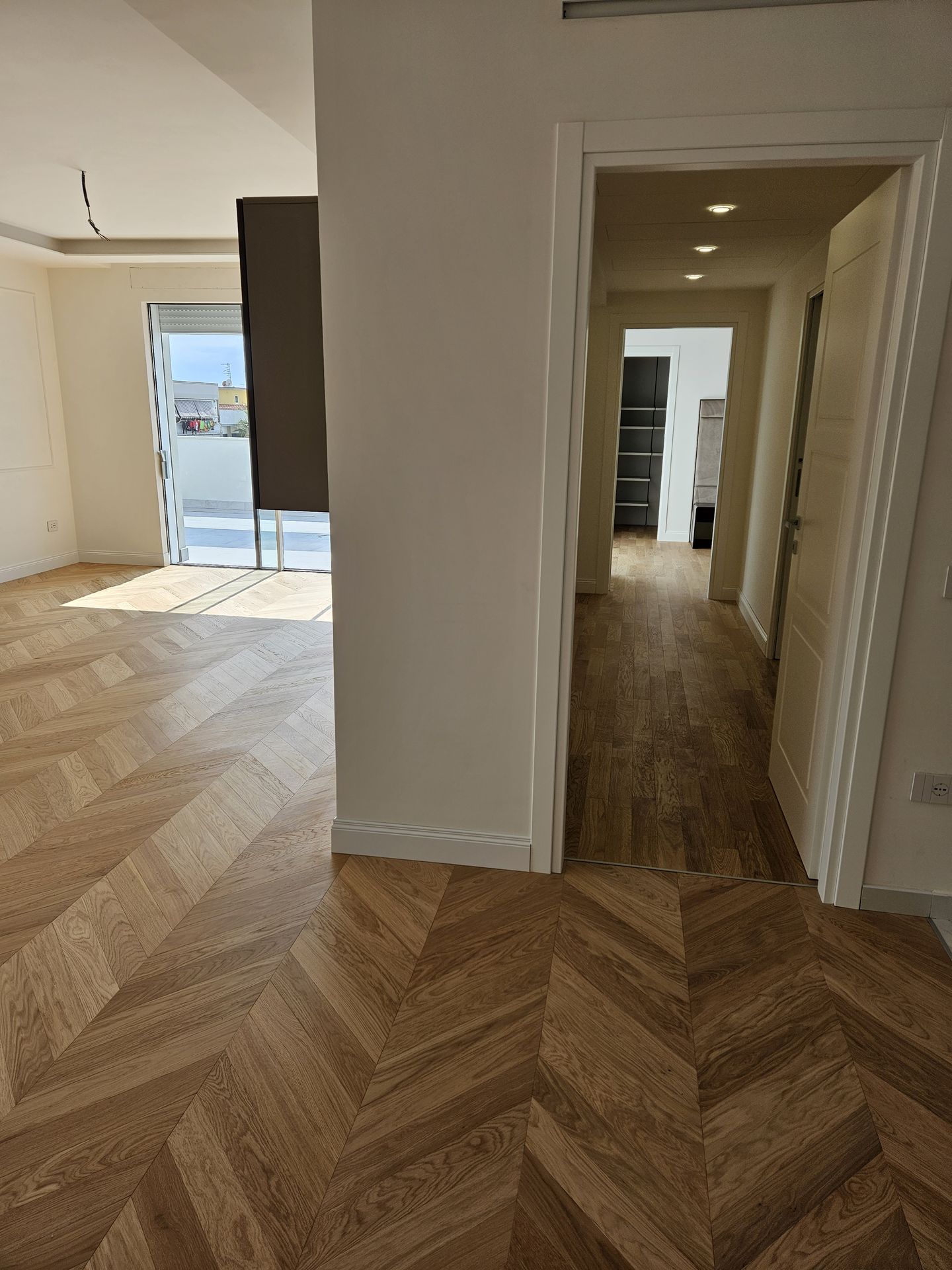 In questo Appartamento, abbiamo selezionato un Parquet Prefinito in Rovere, con taglio a 45° e con una finitura opaca. Questa combinazione porta all’ambiente uno stile Raffinato ma al tempo stesso Moderno. Incorniciato da un Battiscopa Ducale laccato 9010.